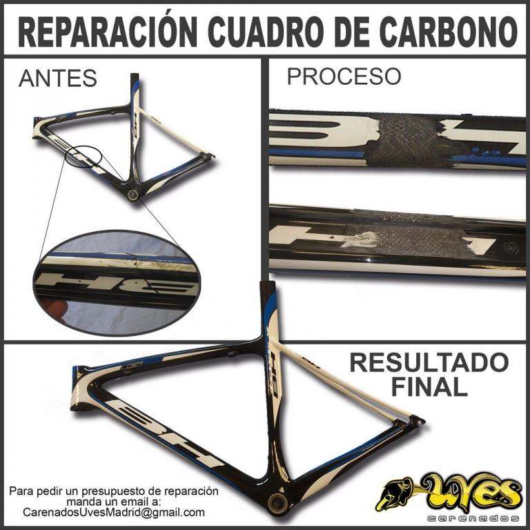 - Uves Bikes: Reparación y pintura de todo tipo de bicis, cuadros de aluminio, carbono, casi nada se nos escapa, podemos reparar tu cuadro por rotura , podemos pintar tu bici como estaba, o podemos pintarla completamente distinta si lo quieres, si te has cansado de verla igual o incluso si compras un cuadro de carbono entero, pero no te gusta toda así (lo hacemos habitualmente).