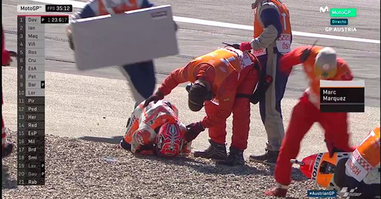 El día ha comenzado con problemas para Marc Márquez. El piloto del Repsol Honda ha sufrido una caída en el ecuador de la FP3 del Gran Premio de Austria a la llegada de la curva número 3 del circuito Red Bull Ring, una brutal frenada en la que los pilotos pasan de 300 km/h a 90 km/h en cuestión de segundos.
