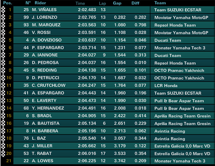 El top 10 lo han completado Dani Pedrosa (8º +1.554), Redding (9º +1.655) y Petrucci (10º +1.687). El debutante Alex Lowes, que sustituye aquí al lesionado Bradley Smith, finaliza en última posición, a 3.7 segundos de VIñales.