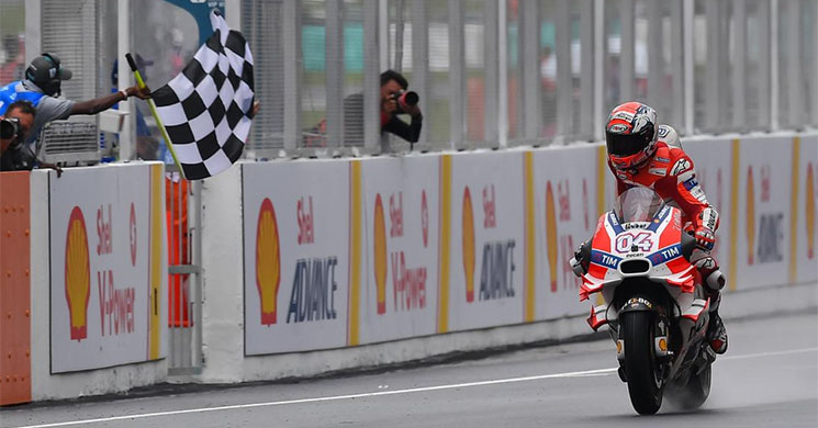 Victoria, vuelta rápida y pole position. Andrea Dovizioso ha firmado un fin de semana perfecto en Sepang, convirtiéndose en el noveno ganador de una carrera de MotoGP esta temporada. El de Ducati ha vencido en una carrera marcada por la lluvia y las caídas en el grupo de cabeza, venciendo a un Valentino Rossi que, a falta de cinco vueltas para el final, se despedía de sus opciones a la victorias colándose a final de recta.