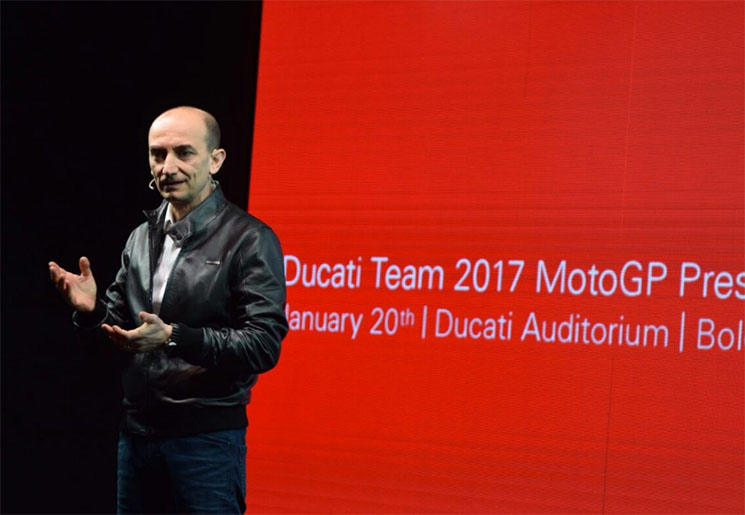 El máximo responsable de Ducati también ha recordado las dos victorias de Andrea Iannone y su compañero Dovizioso en 2016, y ha remarcado la importancia que supuso para la fábrica la llegada de Gigi Dall'Igna hace ahora tres años. En Ducati saben que 2017 no será fácil, y ha destacado a pilotos como Marc Márquez por su fortaleza, pero su objetivo es claro: ganar el título mundial.