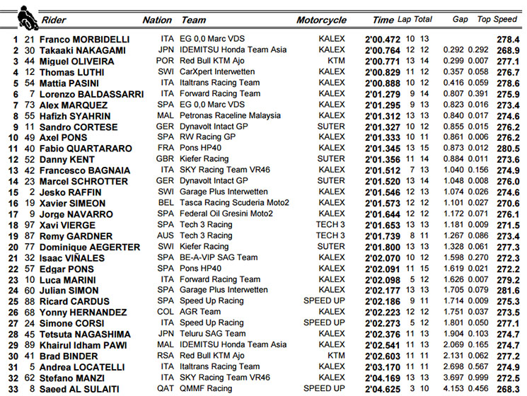 En Moto2, ya con la pista seca, Franco Morbidelli tampoco dejaba pasar la ocasión de liderar el Warm-Up. El poleman de este Gran Premio de Qatar lideraba la sesión con un 2'00.472, un tiempo que no se queda lejos del 2'00.349 que le dio la pole en el último FP3, un resultado que invita a pensar en un buen nivel de grip en la pista para las carreras de la noche.