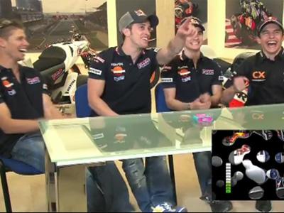 Entre risas y bromas, los cuatro se enfrentan al reto de descubrir, antes que sus compañeros, la imagen que se esconde en la pantalla y que poco a poco se va aclarando, hasta desvelar su contenido nítidamente. El joven Márquez y su compañero Pedrosa son los más rápidos en varias ocasiones, mientras que Stoner, quizás por el idioma, es el más tímido en el juego.