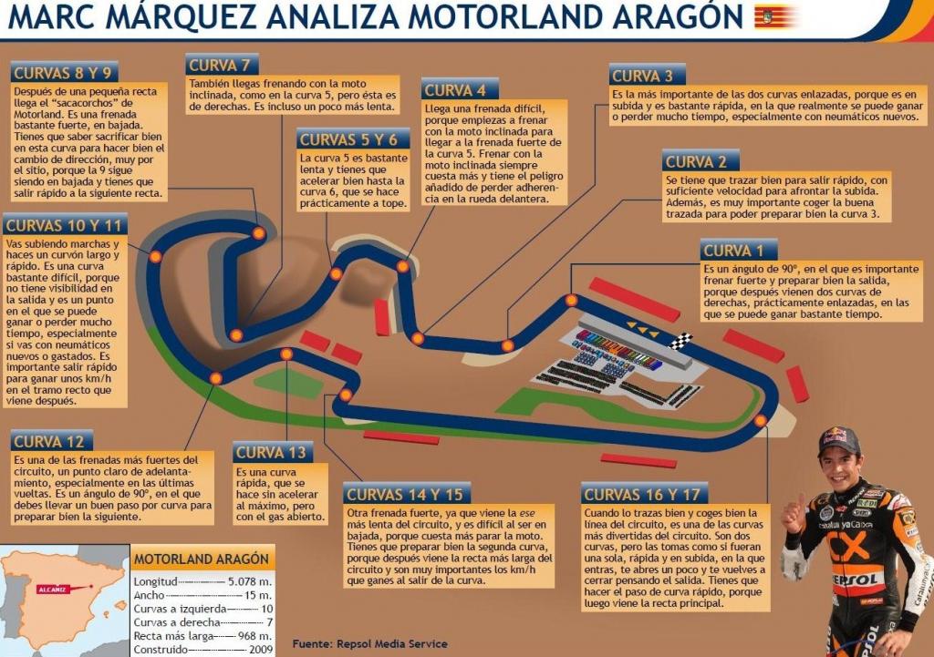 Las 10 curvas de izquierdas y 7 a derechas que componen el trazado español de Motorland Aragón son el próximo reto para Marc Márquez y su Moto2. La localidad de Alcañiz recibirá este fin de semana el Mundial de MotoGP, y ésta será la tercera prueba en casa para el piloto Repsol.