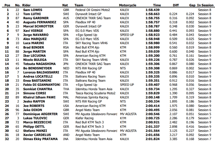 El piloto más rápido del día ha sido Sam Lowes que ha pulverizado el récord del circuito que había marcado Jonas Folger en 2016 (1'59.052). El piloto del Federal Oil Gresini Moto2 ha parado el crono en 1:58.439, confirmando así su buen estado de forma tras volver a la que fuera su casa en el pasado.