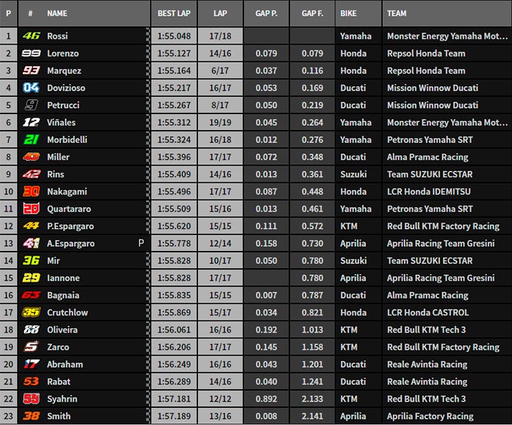 La igualdad en este primer libre de Losail ha sido máxima tal y como demuestra la tabla de tiempos: hay que irse hasta el puesto 17, donde aparece Cal Crutchlow, para encontrar al último piloto situado a menos de un segundo del crono de Valentino Rossi.