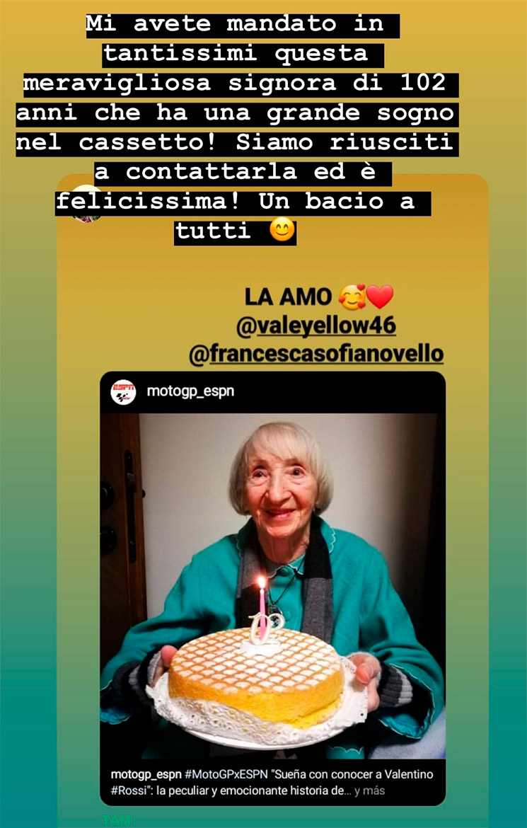 Como era de esperar, la historia no tardó en llegar a oídos de Valentino Rossi, que sigue confinado en su domicilio de Tavullia en compañía de su madre y de su pareja, la modelo Francesca Novello. Precisamente ha sido esta última, a través de su cuenta de Instagram, la que ha confirmado que el piloto de Yamaha ya se ha puesto en contacto personalmente con 'Nona Lina' para cumplir su sueño de conocer en persona al nueve veces campeón del mundo, un encuentro que se producirá cuando finalice la cuarentena en Italia, de momento alargada hasta el próximo 13 de abril.