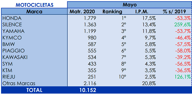 En motos de carrera, la Kawasaki Z 900 lideró el ranking en mayo con 219 ventas (-32,8%), acabando por delante de la Honda CB650R y sus 167 matriculaciones, un 60,6% más, un aumento lógico si tenemos en cuenta que este modelo no empezó a comercializarse en España hasta finales del mes mayo de 2019. La Yamaha T-MAX 500 resiste en la tercera posición con 141 matriculaciones (-41%), seguida de la BMW R 1250 GS con 85 unidades (-65%) y la Honda CB 500 X con 80 unidades (-56%).