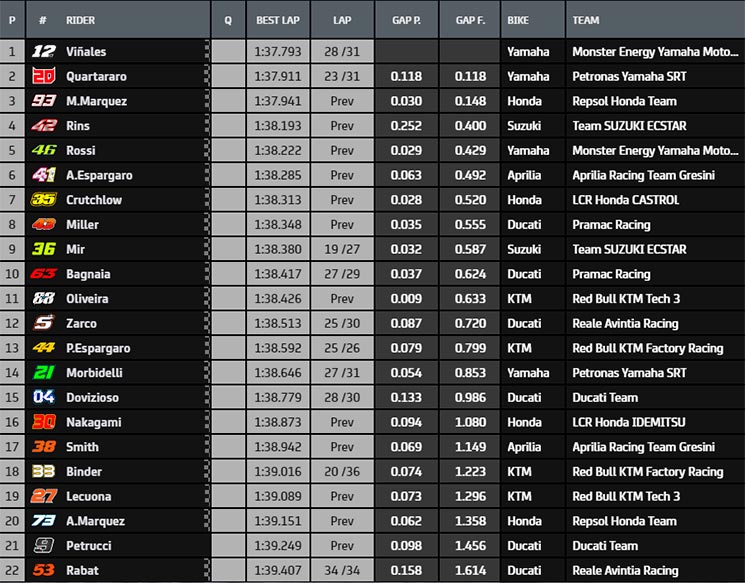 Si por la mañana Marc Márquez establecía el mejor crono con un registro de 1:37.941 por debajo del récord de carrera, por la tarde era Maverick Viñales quien se encargaba de limar 148 milésimas al registro del #93 para terminar liderando la tabla combinada de tiempos con un 1:37.793, un crono que el piloto de Yamaha lograba en la parte final del entreno, poco antes de las 16:20 de la tarde.