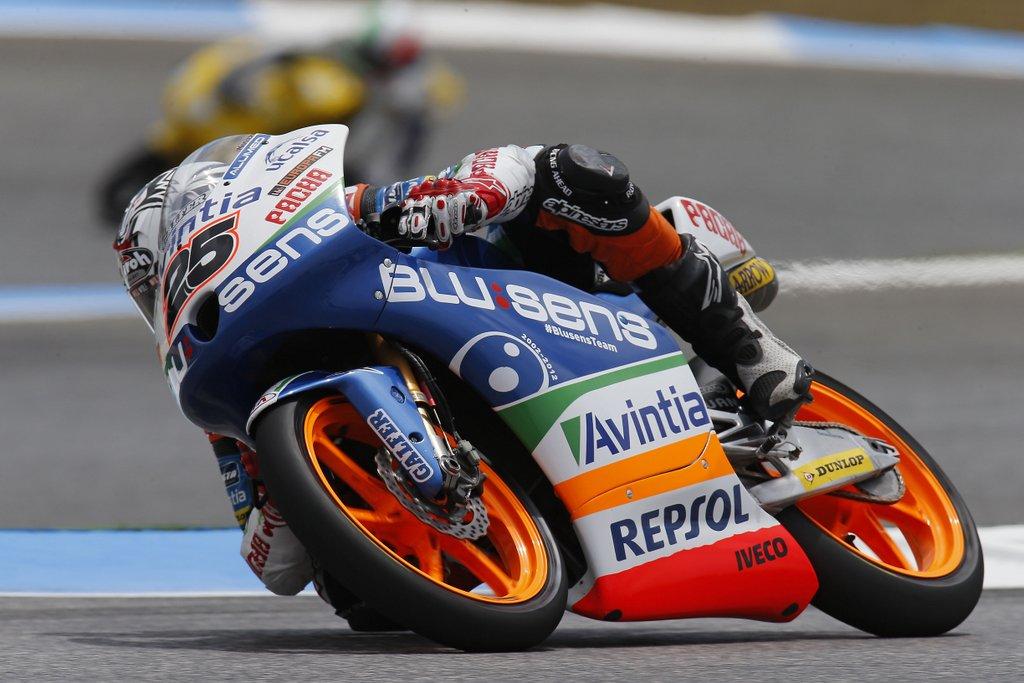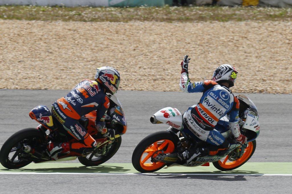 En solitario, el español vencedor en Catar cogía la cabeza de la carrera y trataba de escaparse de su máximo rival Cortese sin éxito. A falta de nueve vueltas para el final, Fenati se iba al suelo perdiendo toda opción de coger puntos y defender así la primera plaza en la clasificación del Mundial que sostenía antes del Gran Premio de Portugal.