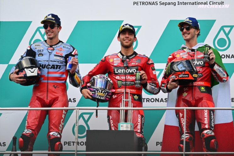 Fuera ya de la batalla por el título, Marco Bezzecchi (3º 323p.) seguro que plantará batalla este fin de semana en una pista favorable a la configuración de la Ducati, la misma en la que Enea Bastianini ganó la pasada campaña sobre la GP21 del equipo Gresini; 'La Bestia' parece haber despertado de su letargo, y tras brillar en Sepang el pasado domingo, el compañero de Pecco Bagnaia seguro que también estará delante en Losail desde el viernes, formando piña con su vecino de box en la lucha por el título.