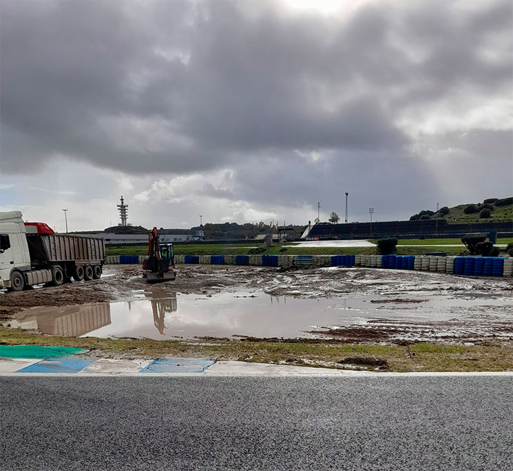 Según datos oficiales, se registraron más de 120 litros por metro cuadrado en menos de media hora durante la tarde del pasado lunes. Esto provocó el desbordamiento del Arroyo del Gato, que atraviesa parte de las instalaciones, inundando con agua, barro y grava las curvas 7, 8 y 11. La escapatoria asfaltada de la curva 13 (curva Jorge Lorenzo) fue una de las más afectadas, presentando levantamientos en el asfalto que requerirán reparaciones antes de volver a recibir actividad en pista.