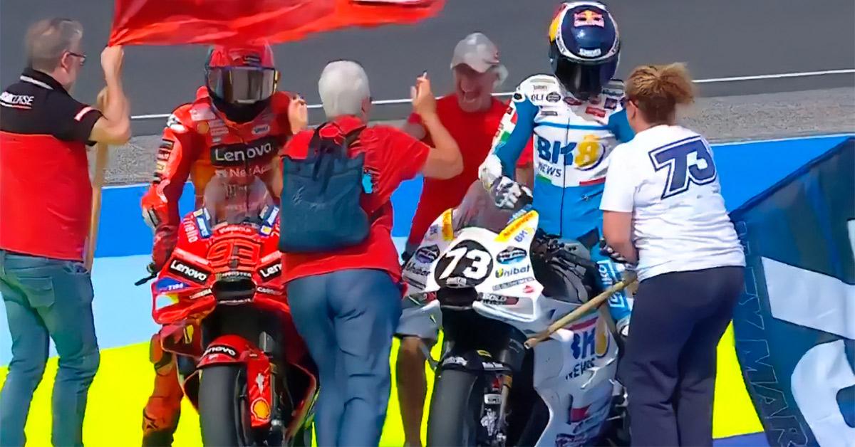Bezzecchi, que iba con la lengua por fuera, hizo todo lo posible por evitar que Marc quedara fuera de su radar. En el arranque de la última vuelta, la distancia entre ambos era de casi medio segundo, lo que dejaba a Bezzecchi fuera de la aspiración de la Ducati de Marc, sin posibilidad de meterle la moto de forma segura.