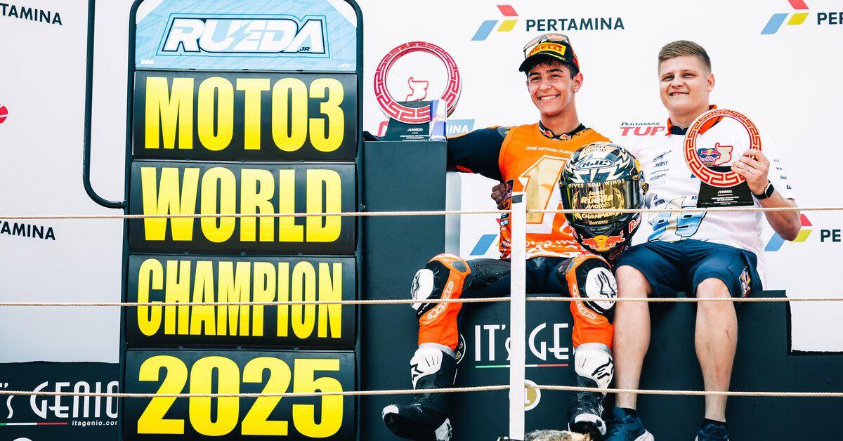 José Antonio Rueda se ha proclamado Campeón del Mundo de Moto3 2025 este domingo en el circuito de Mandalika. El piloto sevillano certificó su primera corona mundial en la categoría pequeña al adjudicarse la victoria en una prueba de infarto, marcada por una caída que provocó una bandera roja que dio por finalizada la carrera, entregándole el título en su primer match-ball de la temporada.