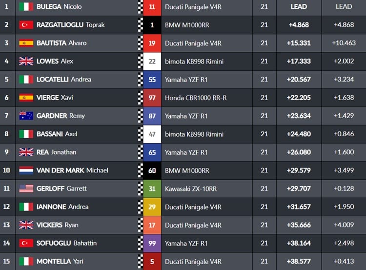 A medida que pasaban las vueltas, el turco aumentaba su ritmo, recortándole varias décimas a Bulega, que le costaba mantener la diferencia en algo más de un segundo. Por su parte, Bautista era tercero, seguido de cerca por Alex Lowes y Andrea Locatelli, que junto a Rea, Vierge, Gardner, Bassani y Van der Mark completaban el top 10.