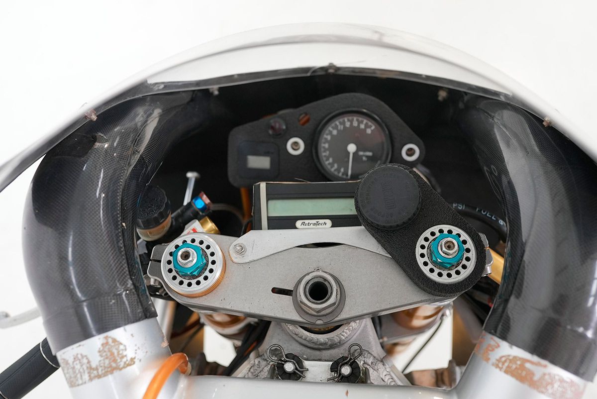Por su parte, la RVF750 RC45 es un ejemplar genuino de fábrica de HRC. Una de sus características técnicas más notables es que tanto el chasis como el motor carecen de numeración estampada, una práctica común en las máquinas de competición de la marca. En su lugar, presenta una placa remachada con un número de bastidor con fines administrativos para el transporte a eventos internacionales.