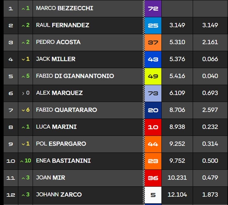 Marco Bezzecchi sigue confirmando que es uno de los pilotos a tener en consideración esta temporada tras una batalla prácticamente perfecta con Raúl Fernández en la carrera al sprint del Gran Premio de Australia, en la que tuvo un susto a mitad de carrera y pudo recuperar el terreno perdido para vencer. Le acompañaría en el podio el madrileño, que suma su segundo podio consecutivo y Pedro Acosta.