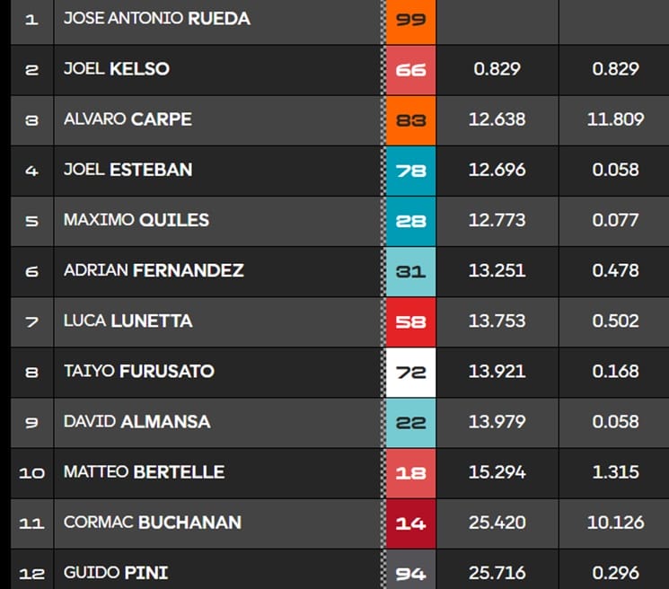 La cuarta posición ha sido para Joel Esteban que siempre que le dan la oportunidad de subirse a la moto, se encuentra en las posiciones de cabeza. Por su parte, Máximo Quiles ha sido quinto, por delante de Adrián Fernández, Luca Lunetta, Taiyo Furusato, David Almansa y Matteo Bertelle.