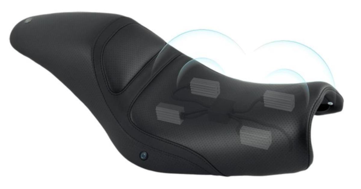 El conjunto está formado por un inserto flexible que se instala bajo el tapizado del asiento e integra cuatro actuadores hápticos independientes, gobernados por una unidad de control propia. No hay elementos visibles ni modificaciones estéticas. Desde fuera, la moto sigue siendo exactamente la misma. Desde encima, también: no cambia la forma ni la ergonomía del asiento, siempre que exista el suficiente acolchado para alojar los actuadores. Por ese motivo, su aplicación queda limitada a motos y scooters con asiento mullido; los asientos deportivos, finos y duros, quedan fuera por una cuestión puramente física.