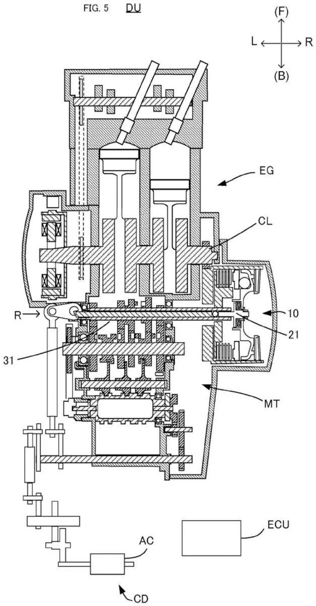 La novedad ahora está en una patente que muestra una versión mucho más sencilla del sistema. En lugar de dos actuadores independientes, Yamaha plantea un único servomotor que se encarga a la vez del embrague y del cambio. La clave está en un sistema de bieletas que conecta el actuador del cambio con el brazo del embrague. Cuando el sistema acciona el cambio, al mismo tiempo libera presión del embrague para permitir el engranaje de la marcha, y lo vuelve a acoplar inmediatamente después.