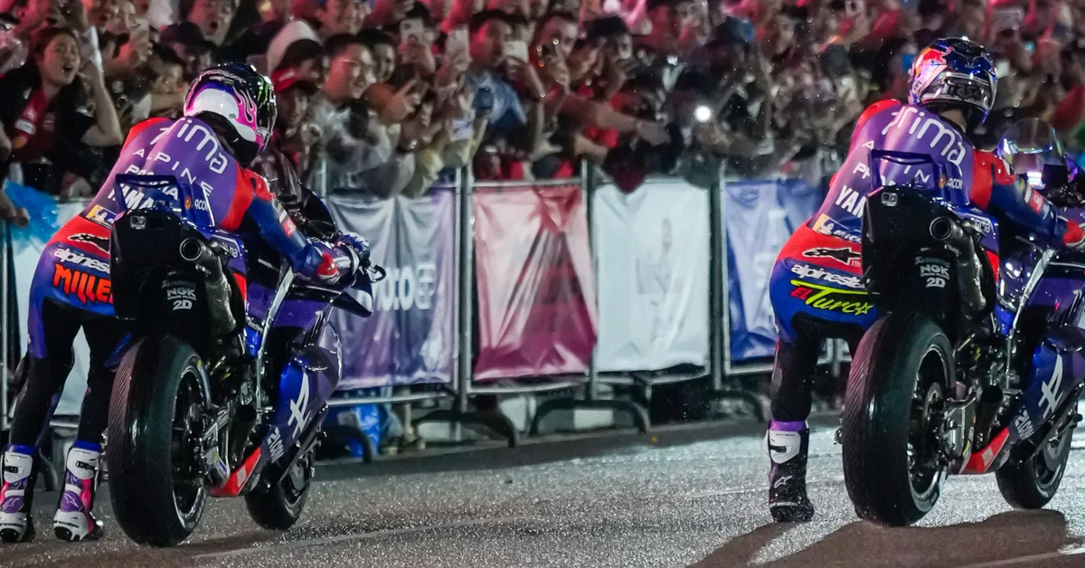 En ese contexto, el dúo del Prima Pramac Yamaha, Jack Miller y Toprak Razgatlioglu, fue la excepción más llamativa. Abrieron el desfile improvisando, bajándose de la moto para deslizar las botas sobre el asfalto mojado y atreviéndose incluso con algunos ‘stoppies’. No fue sencillo. Razgatlioglu explicó después que primero tuvieron que calentar los discos de freno de carbono para que funcionaran mínimamente bajo la lluvia. Miller, fiel a su estilo, se lo tomó con humor.