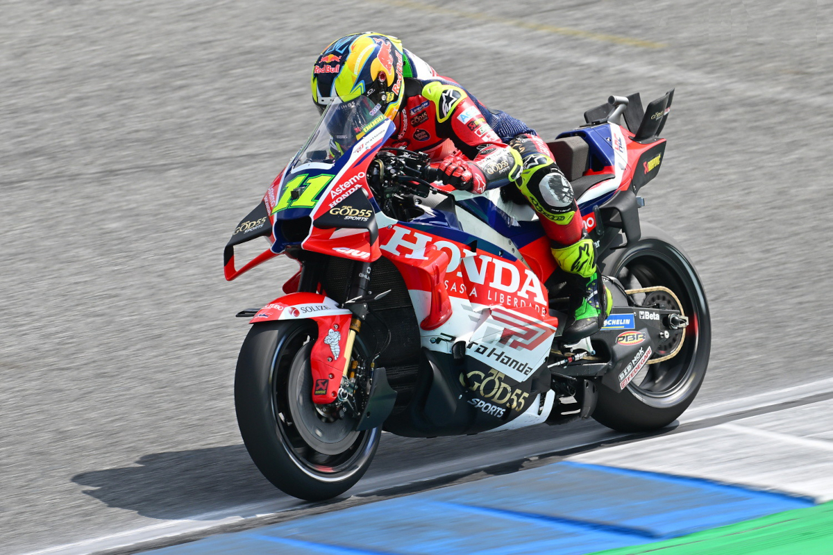Primero Bagnaia, vinculado históricamente a Suomy, apareció con un casco sin identificación comercial visible, pero claramente el que utilizaba, por la forma, era el nuevo casco de Alpinestars. Bastianini, patrocinado por KYT, también rodó con un modelo distinto al habitual para él, un Arai potencialmente identificable por su calota en forma de huevo. Y el otro fue Moreira, igualmente asociado a KYT, que utilizó un Shark sin branding destacado. El motivo es el mismo en todos los casos: sus modelos contratados todavía no estaban oficialmente registrados como FIM 2 en la base de datos de la federación.