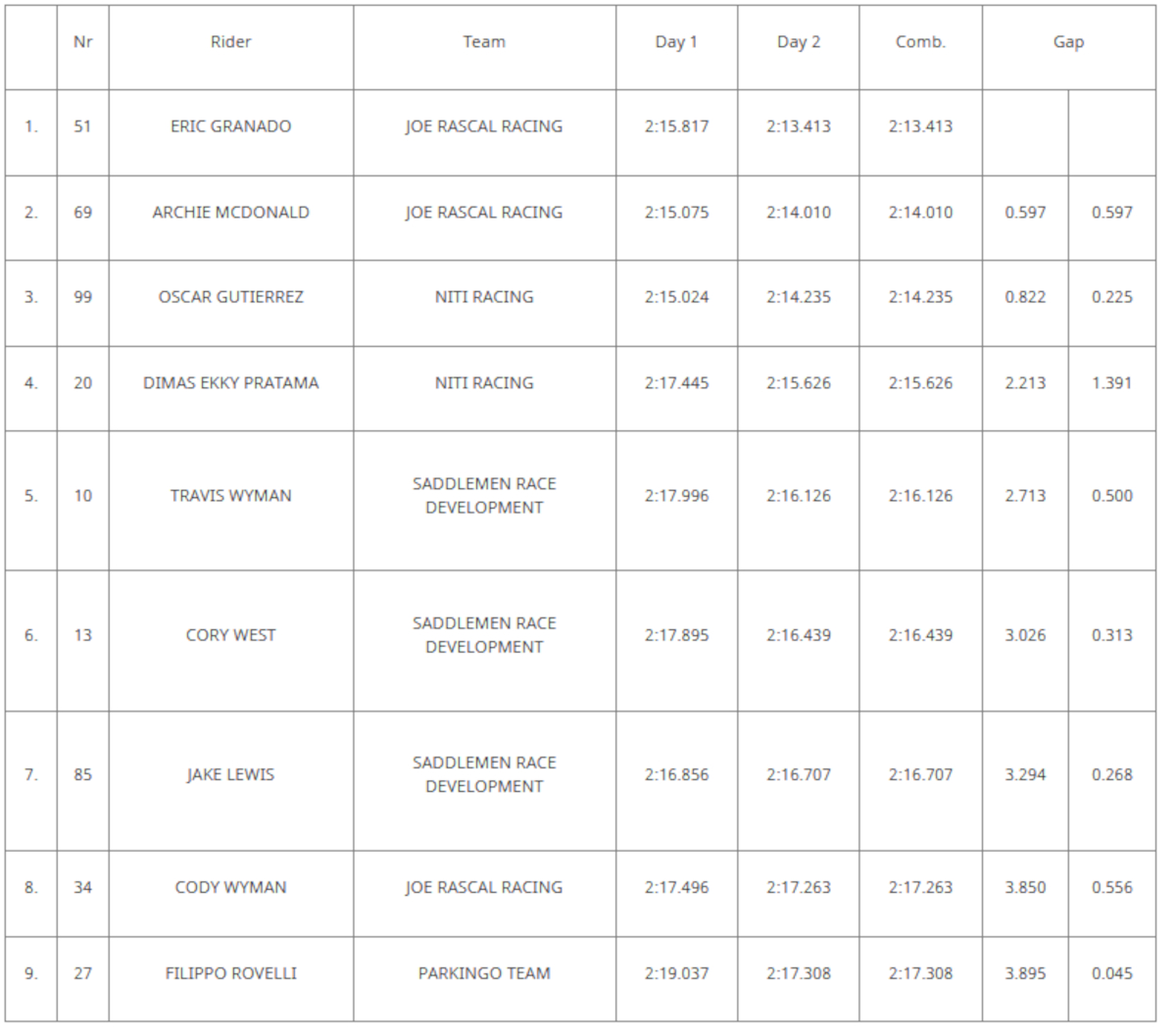 En lo deportivo, el más rápido ha sido Eric Granado, que ha parado el crono en 2:13.413 tras completar un total de 578 vueltas entre todos los participantes. Un tiempo que, puesto en contexto, se queda muy lejos de los registros habituales de MotoGP en el mismo circuito, dejando esa diferencia cercana a los 15 segundos que evidencia el concepto completamente distinto de estas máquinas. Tras el brasileño, Archie McDonald ha terminado segundo a menos de seis décimas, mientras que el español Óscar Gutiérrez ha cerrado el top 3. El resto de la parrilla ha quedado bastante compacta, con diferencias inferiores a cuatro segundos entre los nueve pilotos presentes.