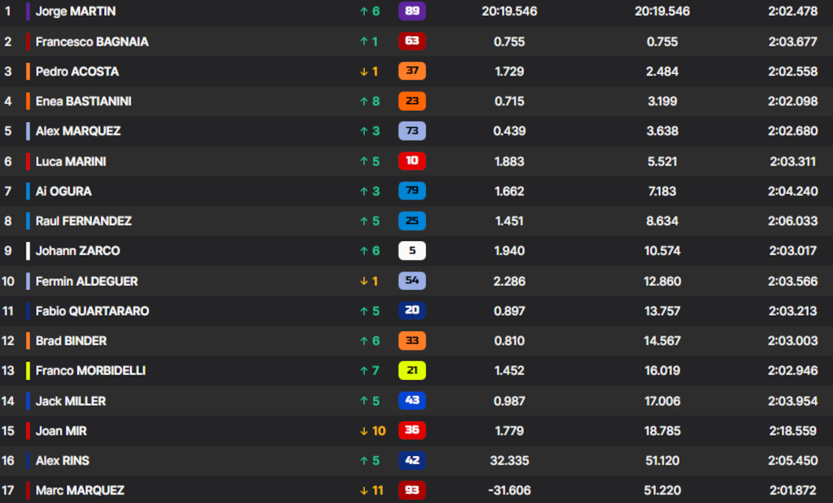 Tras la carrera, la general de MotoGP queda a favor de Martín, que es líder con 57 puntos, solo con uno de ventaja sobre Bezzecchi, y a 8 de Acosta. Di Giannantonio está a 20, y Márquez es 6º a 23.
