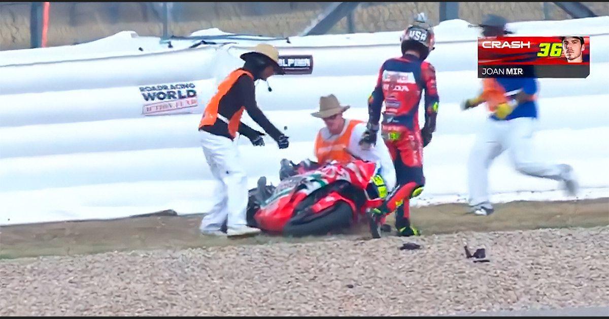 El domingo en EEUU empezó con Mir peleando en el grupo de las Ducati, echándole muchas ganas y metiendo la moto donde podía. Pero la mala suerte apareció pronto. Un susto importante en los primeros giros le obligó a irse largo para salvar la caída, pisando fuera de los límites de la pista.