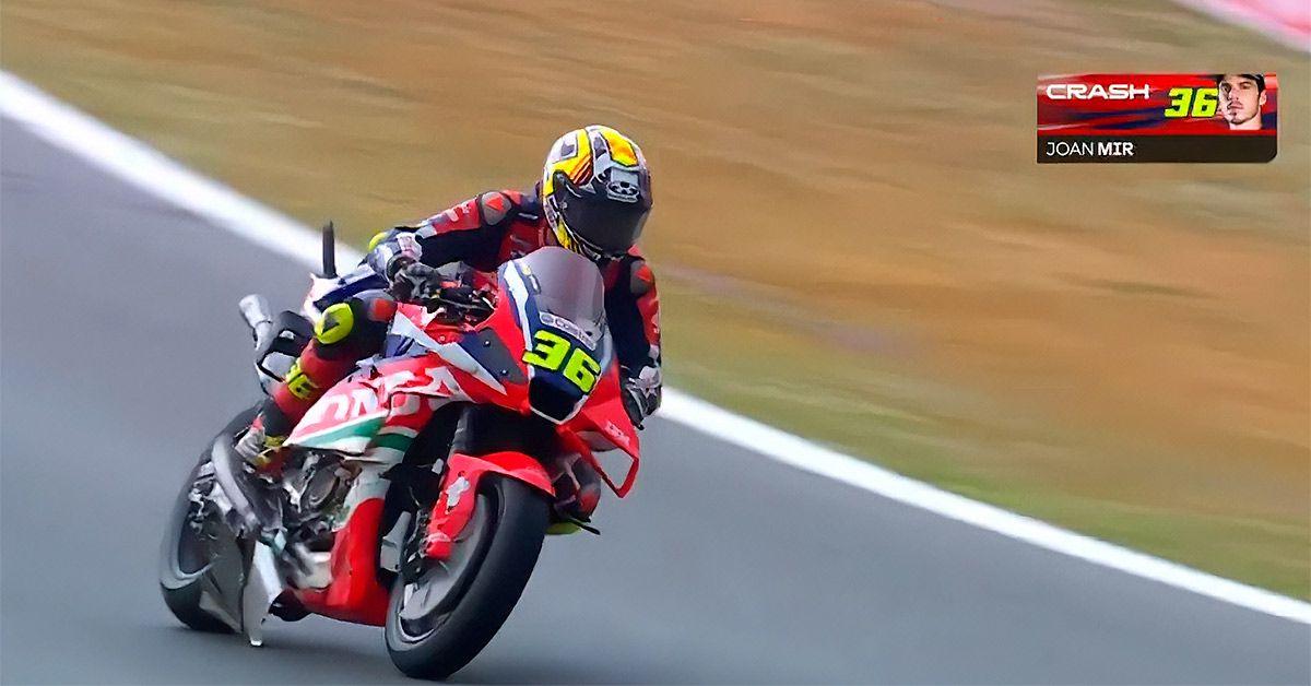 Todo empezó durante la segunda sesión de entrenamientos libres. En un Jerez que se puso delicado por la lluvia, Mir se fue al suelo. Logró levantar la moto y volver a la pista para intentar llegar al garaje, pero su Honda RC213V estaba bastante perjudicada. Tenía piezas de la carrocería sueltas y dañadas que podían saltar por los aires en cualquier momento.