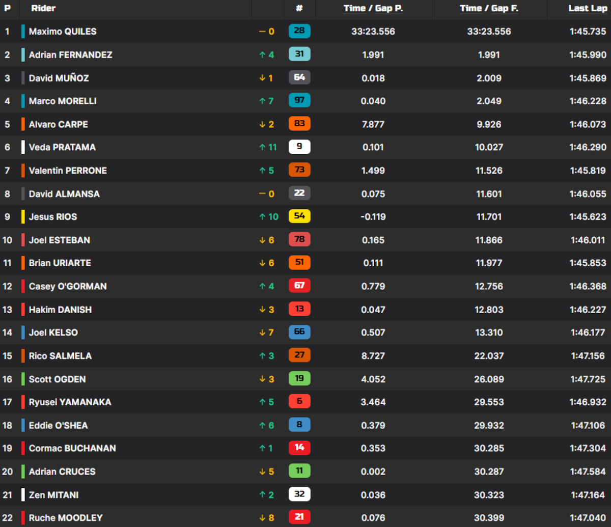Ahí se formó el trío clave: Quiles, Fernández y Muñoz. Tres pilotos con ritmo suficiente para abrir hueco respecto al resto, mientras por detrás el grupo perseguidor se rompía en varias peleas. Morelli, mientras tanto, empezaba a asomar desde atrás con un ritmo muy serio.