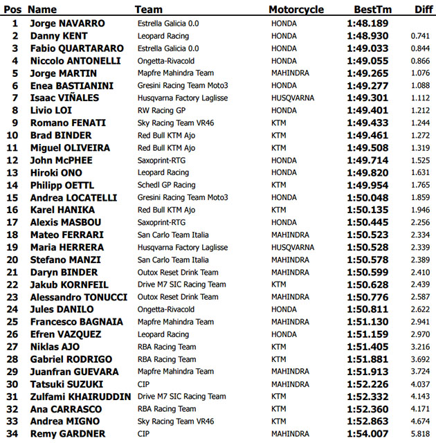 Uno de los pilotos más activos en pista durante estos tres días ha sido el vigente campeón de la categoría, Tito Rabat, que ha acumulado algo más de 120 vueltas en mojado desde el martes. Hoy ha sufrido una aparatosa caída que ha dejado su Kalex destrozada, aunque por fortuna Tito ha podido salir por su propio con algunas magulladuras. Julián Simón ha sido el segundo español más rápido de la categoría, finalizando 9º sobre la Speed Up del QMMF Racing Team (+1.891).