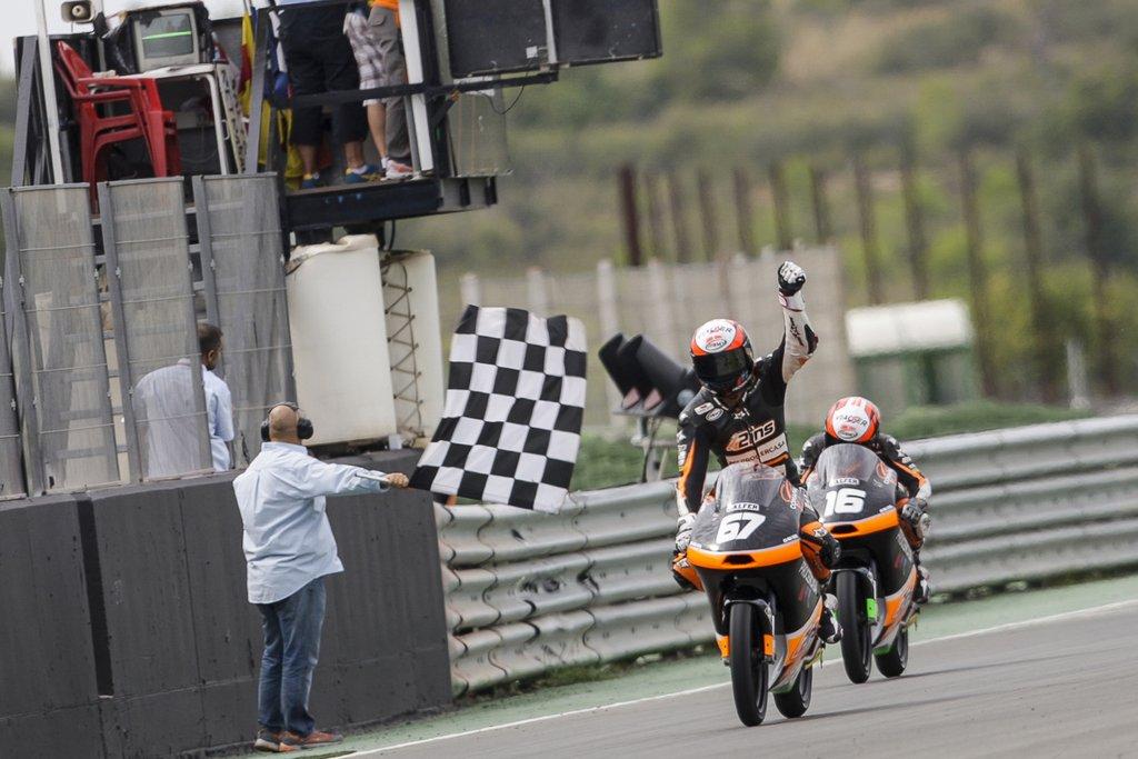 En Moto3 Gerard Riu y Vicente Pérez se estaban jugando gran parte de sus opciones de ser campeones de la categoría. Han estado peleando todo el tiempo por ganar junto a Alex Ruiz y Dennis Foggia pero a Vicente se le ha parado la moto dándole en bandeja el título a Riu. En carrera Alex ha terminado segundo y Dennis tercero.
