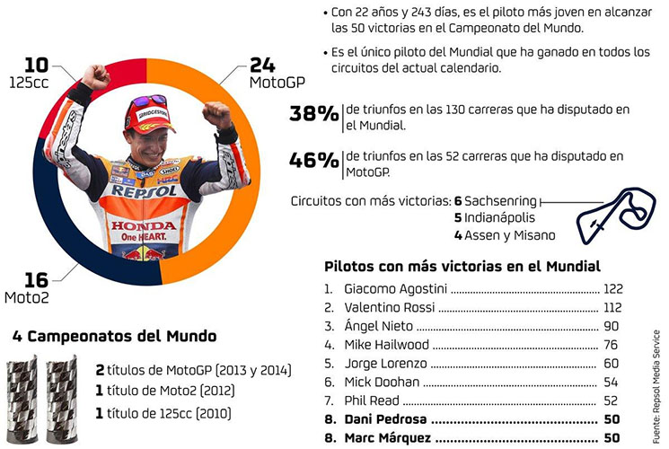 Estas estadísticas han llevado a Márquez a sumar cuatro títulos mundiales, dos en MotoGP (2013 y 2014), uno en Moto2 (2012) y uno en 125cc (2010), y a situarse octavo en el ranking de pilotos con más victorias en el Mundial, en una lista encabezada por Giacomo Agostini, Valentino Rossi y Ángel Nieto. 50 victorias que han dado momentos inolvidables como en Portugal 2010, cuando ganó después de caerse en la vuelta de calentamiento, Valencia 2012, donde venció partiendo último de la nutrida parrilla de Moto2, o Laguna Seca 2013, por citar algunas de ellas.