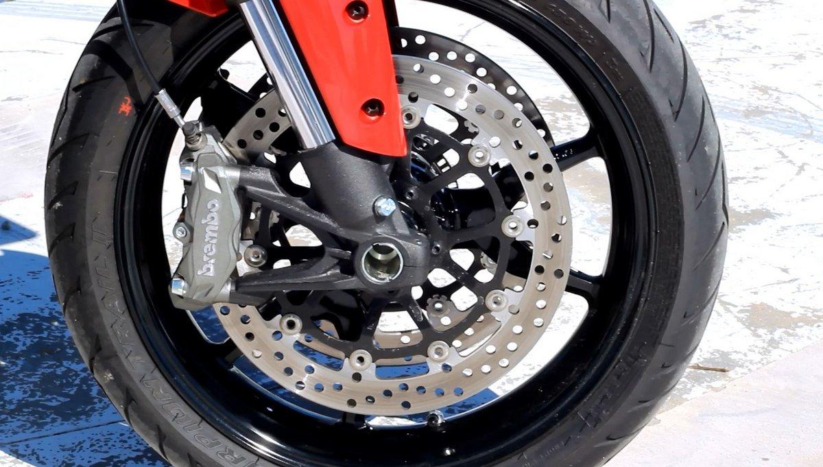 Freno delantero: 2 discos semi-flotantes de 320mm, con pinza radial Brembo monobloque de 4 pistones. ABS con asistencia en curva de serie.