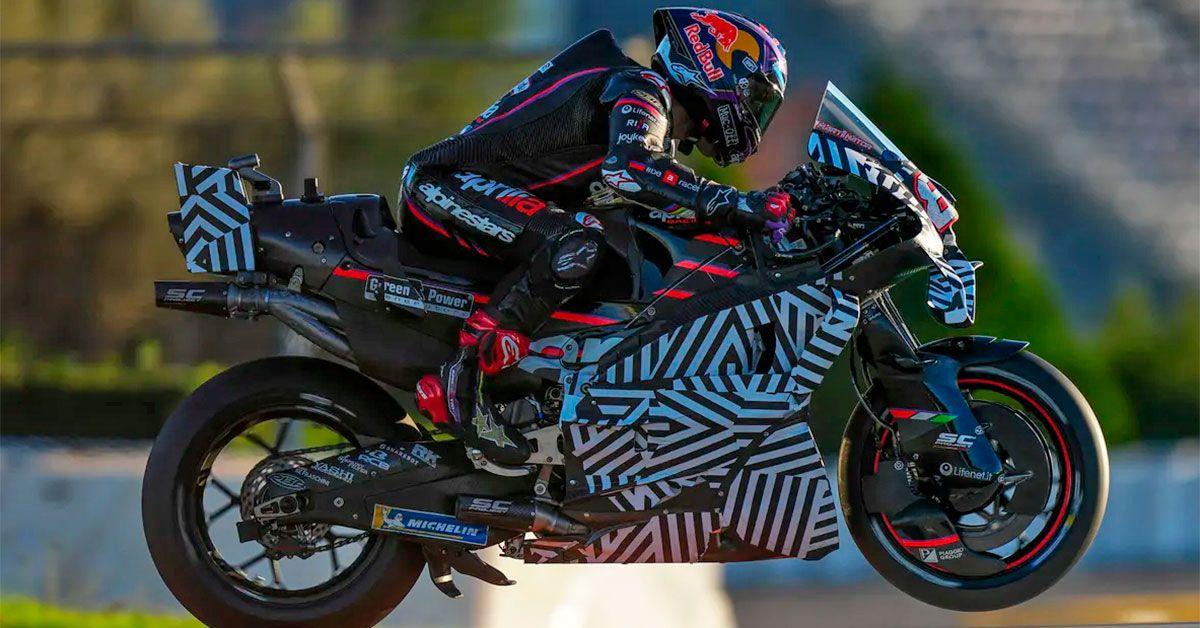 Si había una moto que debía captar los focos en el test oficial de Valencia, esa era la Aprilia. Los de Noale sacaron a pista la novedad más agresiva vista en los test de postemporada: un carenado con decoración de camuflaje tipo cebra.